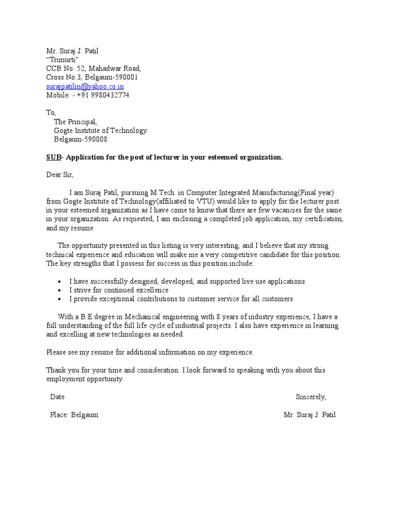 Sample Job Application Letter for the Post of Lecturer from imgv2-2-f.scribdassets.com Read online sample cover letter for lecturer job application in engineeringwe extend the connect to buy and create bargains to download and install sample cover letter for lecturer job application in engineering consequently simple! Make sure to highlight your qualifications and ability to fulfill the job duties despite your lack of experience. Sample cover letter for full time position at university. Writing a great teacher cover letter is an important step in your job search journey. This post contains all the templates for the above mentioned instances in creating a specific job application letter for a teacher post. A cover letter must accompany and be tailored to any application you submit. With more than 11 years of experience instructing university students while. Marshall, i am writing to apply for the assistant lecturer in physics position with springfield college.